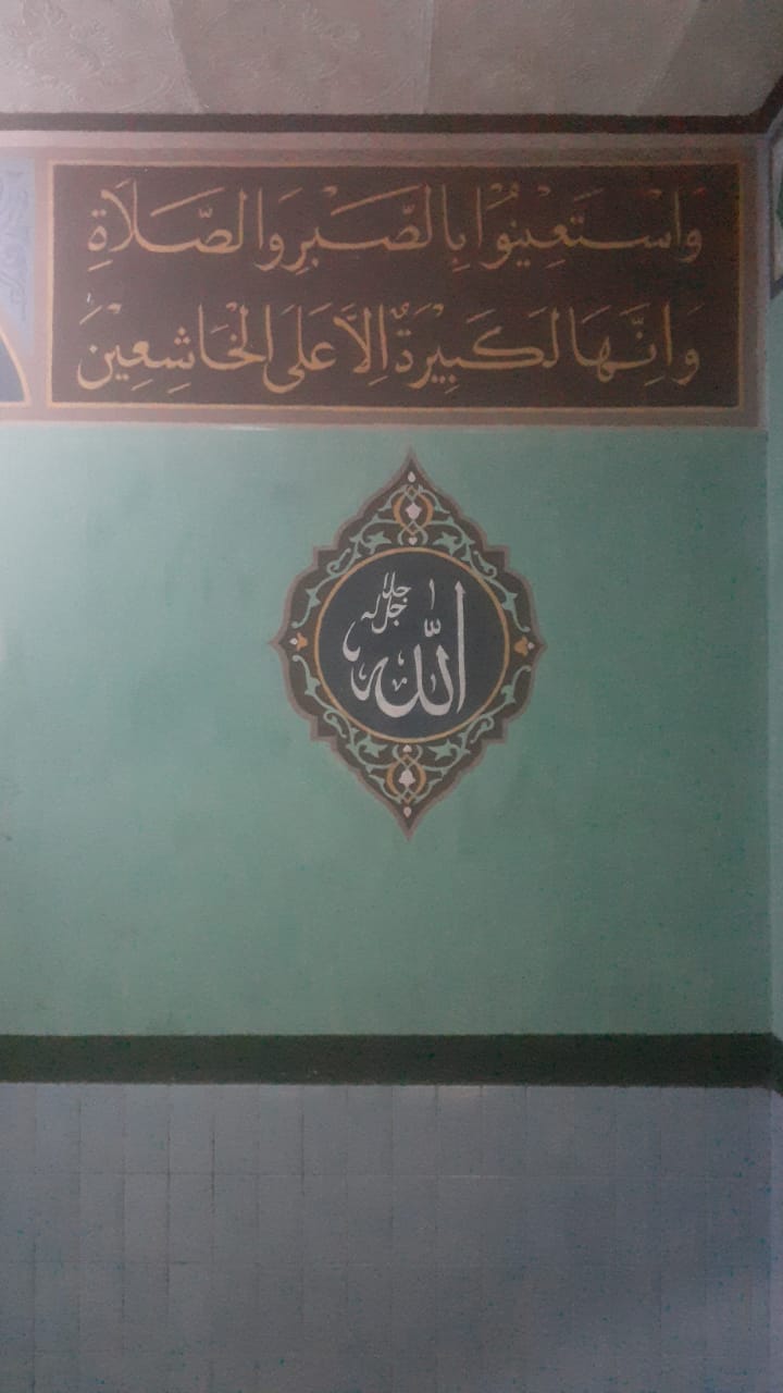 Kaligrafi terlukis di dinding Barat memuat ayat ke-45 dari Surat Al-Baqarah.